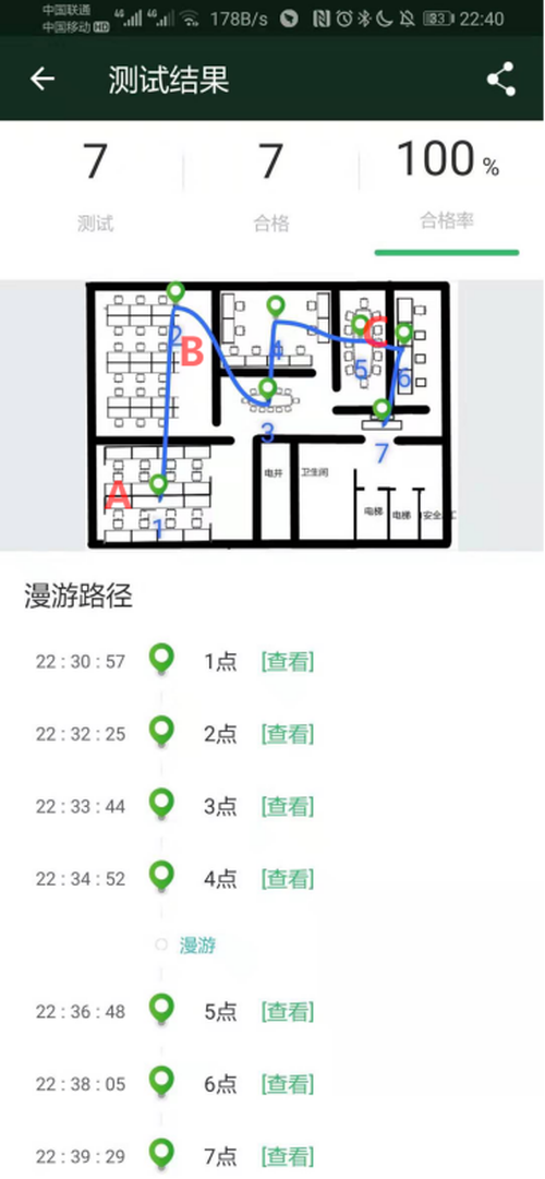 将手机接入无线网络后,小编拿着手机打开WiFi魔盒中的“边走边侧”功能在公司进行“游荡”测试,分别对图中7个点进行来测试,其测试结果如下所示: