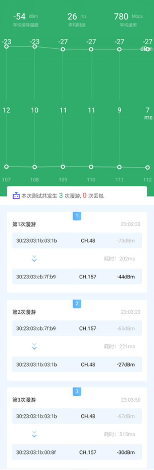同样是使用WiFi魔盒,打开APP中的“漫游测试”功能,并开始测试,通过测试,起结果如下: