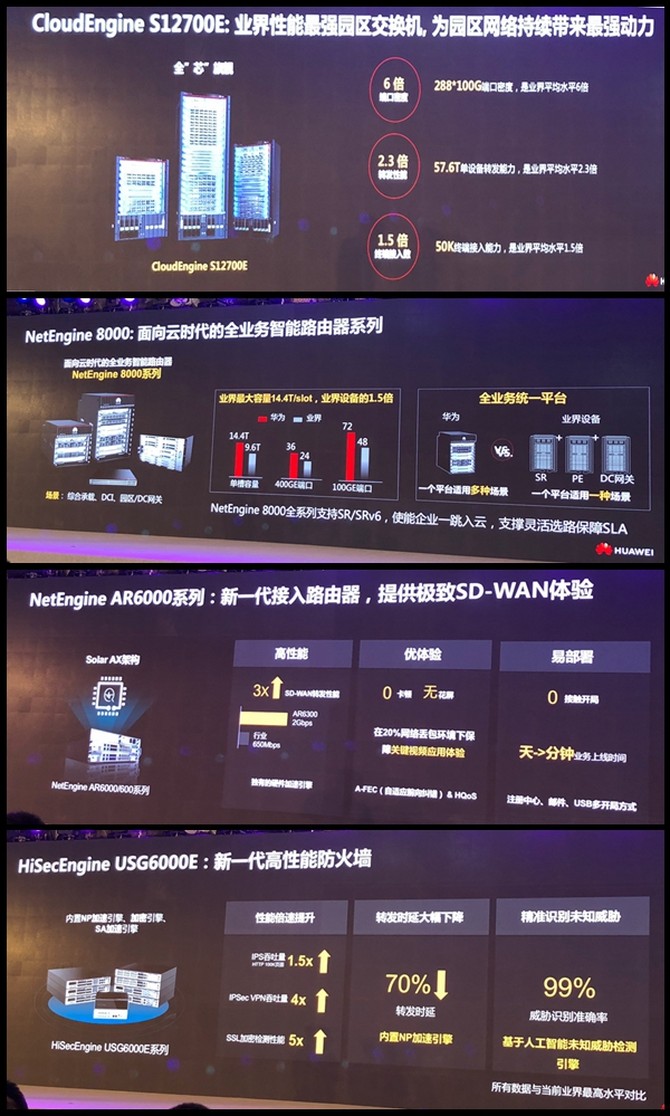 于此同时,华为还在会上展示了S12700E,业界性能最强园区交换机,为园区网络持续带来最强动力;面向云时代的全业务智能路由器NetEngine 8000系列,新一代接入路由器NetEngine AR6000系列产品,提供机制SD-WAN体验;新一代高性能防火墙USG 6000E产品以及携手合作伙伴展示行业解决方案。