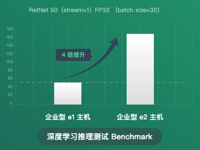 如上图所示,第二代英特尔至强可扩展处理器采用英特尔DEEP LEARNING BOOST矢量神经网络指令(VNNI),提高了人工智能推理训练的表现。与上一代企业型e1主机相比,搭载第二代英特尔至强可扩展处理器的企业型e2云主机在深度学习的多种场景性能提升400%。