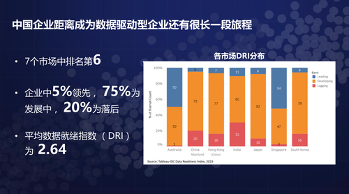 在向数据驱动型企业前进的路上企业需要明了自己位置,日前Tableau 与IDC共同发布了《亚太数据就绪指数(DRI)报告》,调查对来自七个市场(澳大利亚、中国大陆、中国香港、印度、日本、新加坡和韩国)的700多家企业的高管进行了数据就绪的关键维度的调查,维度包括与员工相关的因素(个人和企业)、流程、技术和管理。根据结果将企业数据就绪状态划分为三个阶段,分别是领先、发展中和落后。
