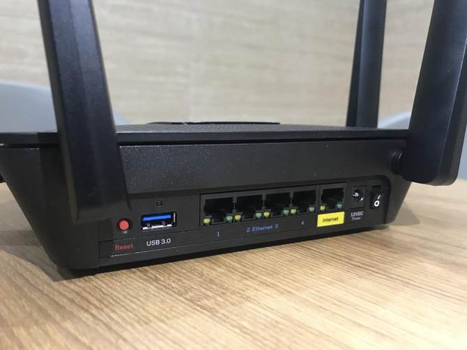 机身背面为端口设计,从左至右依次是复位按键、USB3.0端口、4个千兆LAN口和一个千兆WAN口、电源接口以及电源按键,整体排列非常周正。
