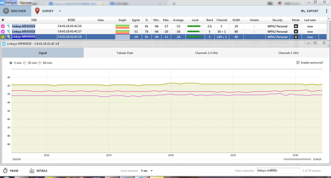 对于电竞爱好者来讲,除了超强的信号范围覆盖之外,信号的稳定性也是至关重要的,毕竟高手间的对决,往往输赢只在一瞬间,如果信号出现不稳定情况,将会带来极不友好的游戏体验,那接下来我们就对Linksys MR9000X无线路由器的信号稳定性进行简单的测试,通过测试得出如下结果(共三个频段,其中粉色代表2.4G,紫色代表5G1,褐色代表游戏专属5G2频段):