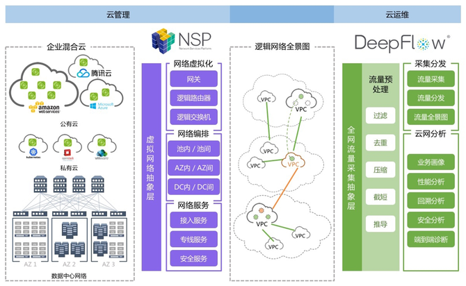 针对虚拟网络面临的全新挑战,云杉网络的云网互联和服务平台(NSP)和虚拟网络流量采集、分发和分析平台(DeepFlow®)产品,一个主管控,一个主监控,二者共同支撑整个数据中心虚拟网络的运营。