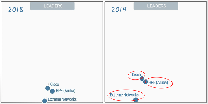 在过去一段时间内,领导者象限里Cisco和HPE(Aruba)两强相争,追得你死我活,难舍难分,而Extreme Networks紧随其后,并逐渐被拉开间距。