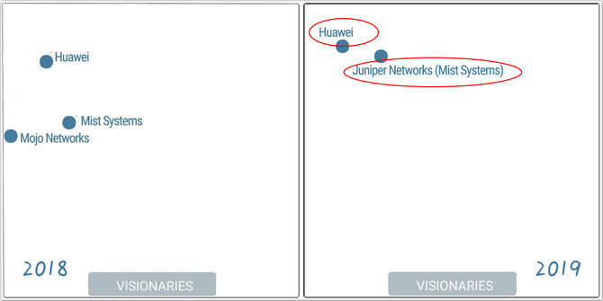 Juniper Networks收购了Mist Systems,因此综合实力上升,得以入围远见者象限(具有高度完整的愿景,但执行力低于领导者)。此次收购将把Juniper的企业产品组合扩展到无线领域,并使其能够在“多云时代的人工智能驱动业务”中占有一席之地。