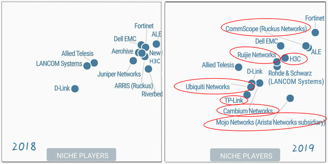 Aerohive (被Extreme Networks收购)、ARRIS/Ruckus Networks (被CommScope收购)、Mist Systems (被Juniper Networks收购)、Riverbed出局。