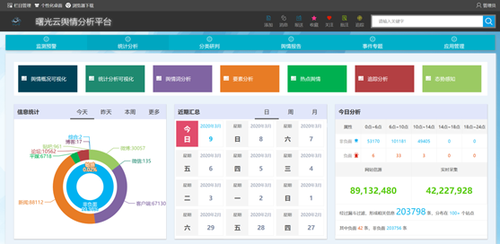 2020年3月12日下午,曙光云舆情分析平台全新发布,该产品是在疫情防控期间诞生的舆情监测工具,主要用于大型企业及政府机构的舆情数据收集、监测、分析及重要信息的发布等。
